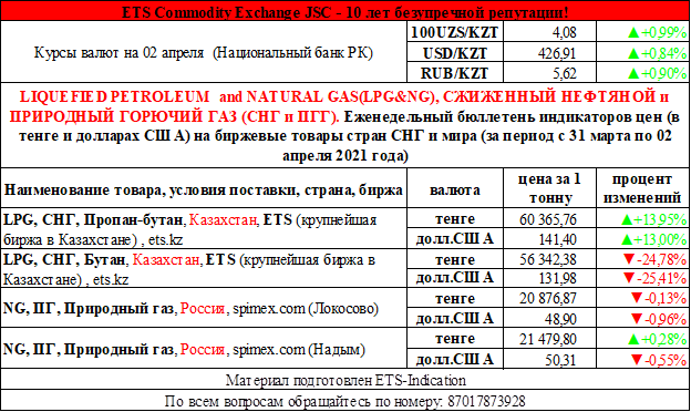По итогам недели с 29 марта по 02 апреля на товарной бирже ЕТС Средневзвешенная цена на пропан-бутан технический в Казахстане составила 60 365,76 тенге за 1 метрическую тонну.
