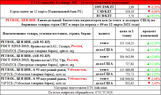 В период с 09 по 12 марта 2021 года цена на бензин марки А 95 на Узбекской Республиканской товарно-сырьевой бирже (УзРТСБ) составила -2,48%.